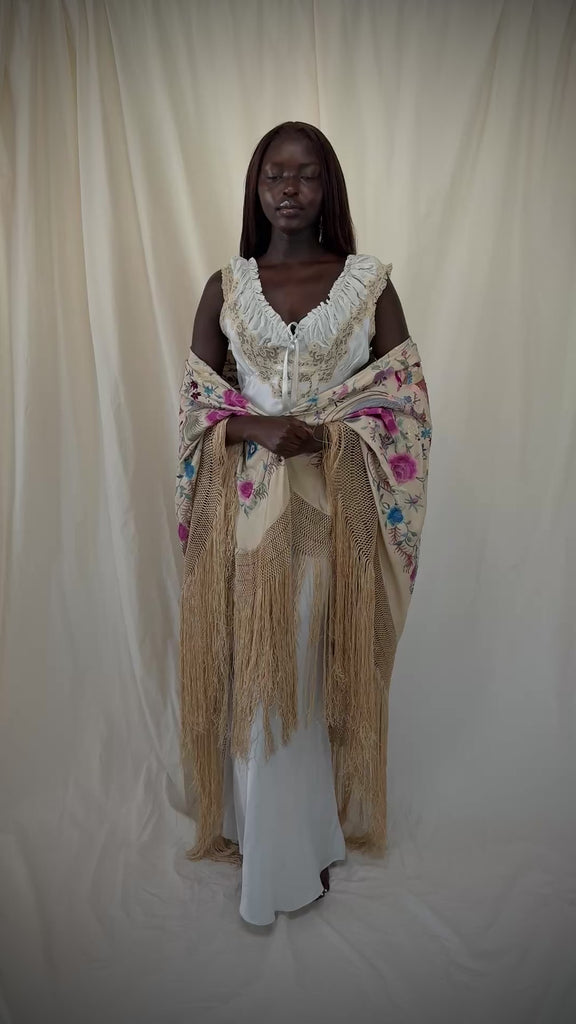 Vintage 1930s exquisite Manila silk shawl. Crafted from luminous silk and adorned with intricate hand-embroidered floral, bird, and butterflies in vibrant rose, blue, and soft botanical hues. This statement piece is finished with dramatic cascading fringe for unforgettable movement.