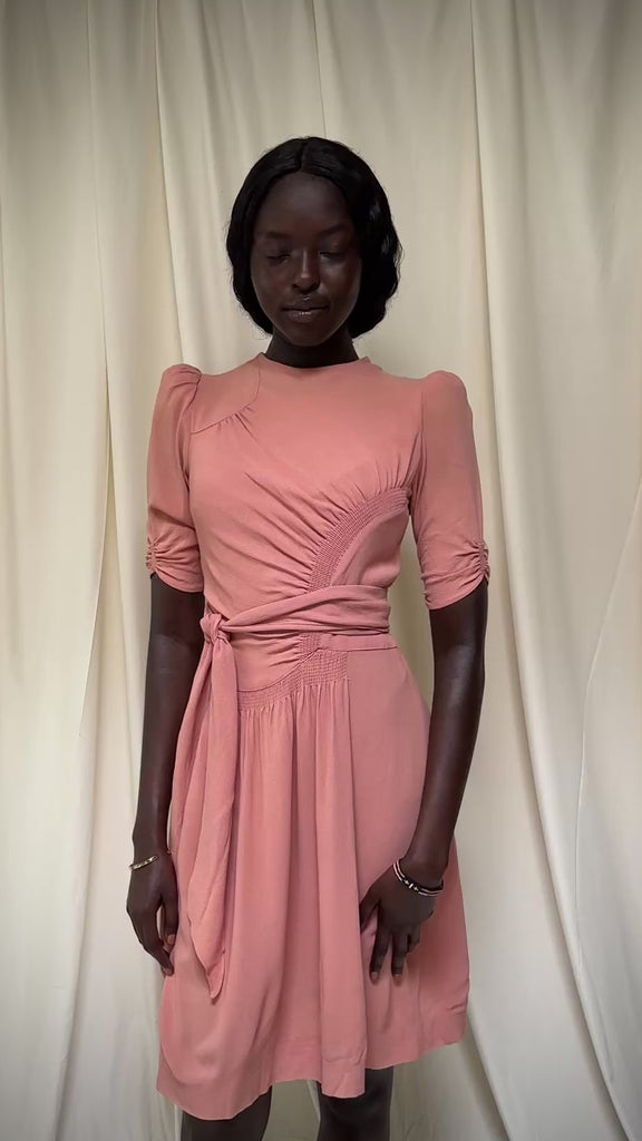 A stunning 1940s rayon dress featuring beautiful smocking and thoughtful construction. This dress is subtle but remarkable in its simplicity and elegance.